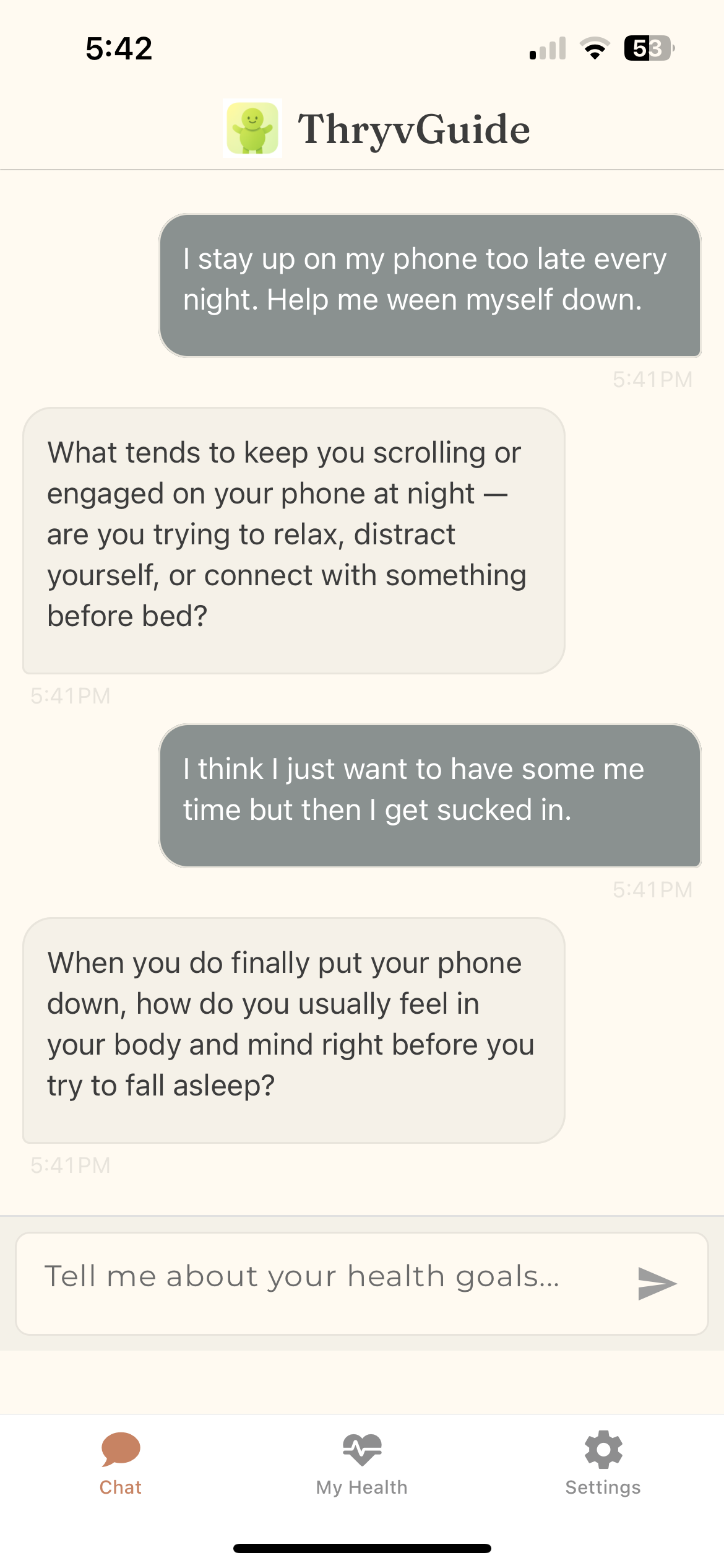 Watch the AI coach guide a user through their first wellness conversation. Notice how it asks follow-up questions, adapts to the user's responses, and begins building a personalized health profile from the very first message.